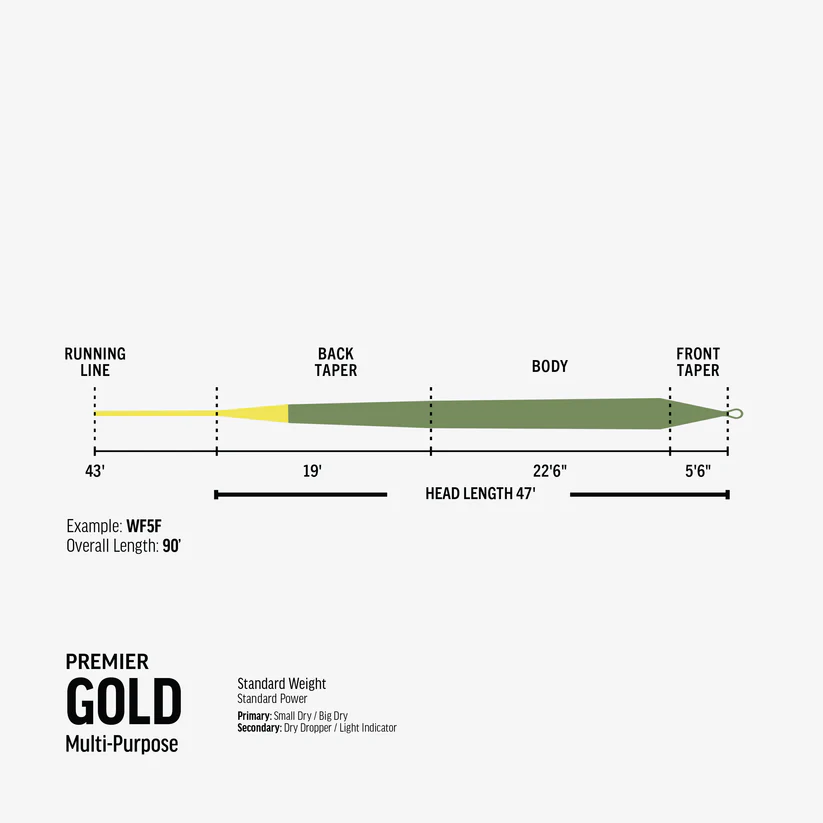 RIO GOLD’s longer head and lighter weight, compared to its XP and MAX counterparts, make it our best all-around trout taper for carrying long, precise casts. At standard weight with a mid-length 5-foot 6-inch front taper (WF5F) for soft presentations, RIO GOLD delivers flies with delicacy and finesse, making it perfect for anglers who rig with dry-fly intent then switch to droppers and light indicators as conditions change. With a 47-foot head (WF5F) and long back taper, it’s the right choice for rivers and lakes that require medium to long casts and distance mends.